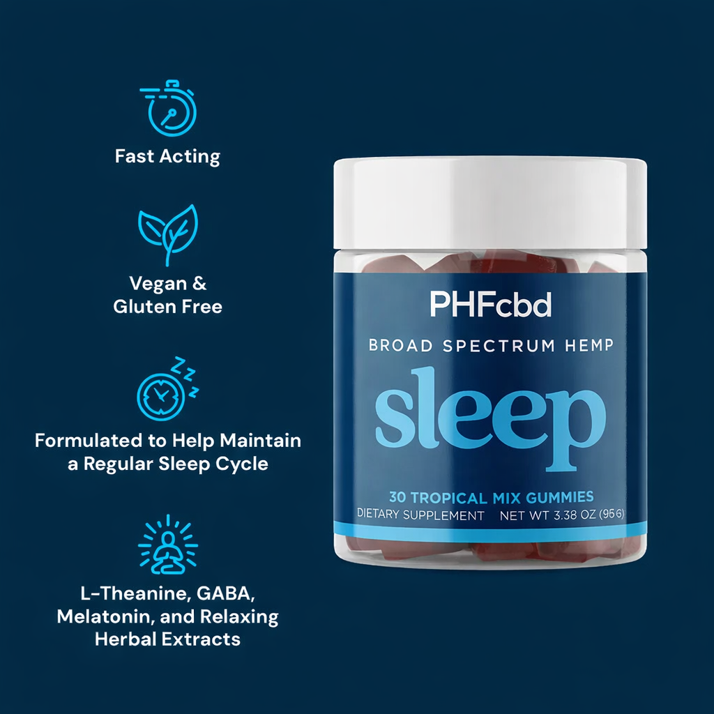 PHfcbd Broad Spectrum CBD Sleep Gummies combine 25mg CBD, 20mg CBN, 5mg melatonin, and calming botanicals to help you fall asleep faster, stay asleep longer, and wake up feeling refreshed. Our gummies are vegan, gluten-free, and THC-free for a clear-headed morning.