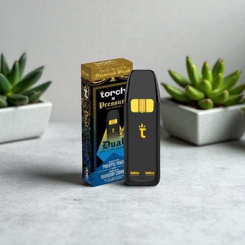 Double the flavor, double the vibe. The Torch x Pressure Dual Vape offers two premium THCA diamond-infused blends in one sleek device. Pineapple Punch (Sativa) brings a fruity kick of energy, while Blueberry Comatose (Indica) delivers sweet sedation. Switch flavors anytime with this stylish split-chamber vape.